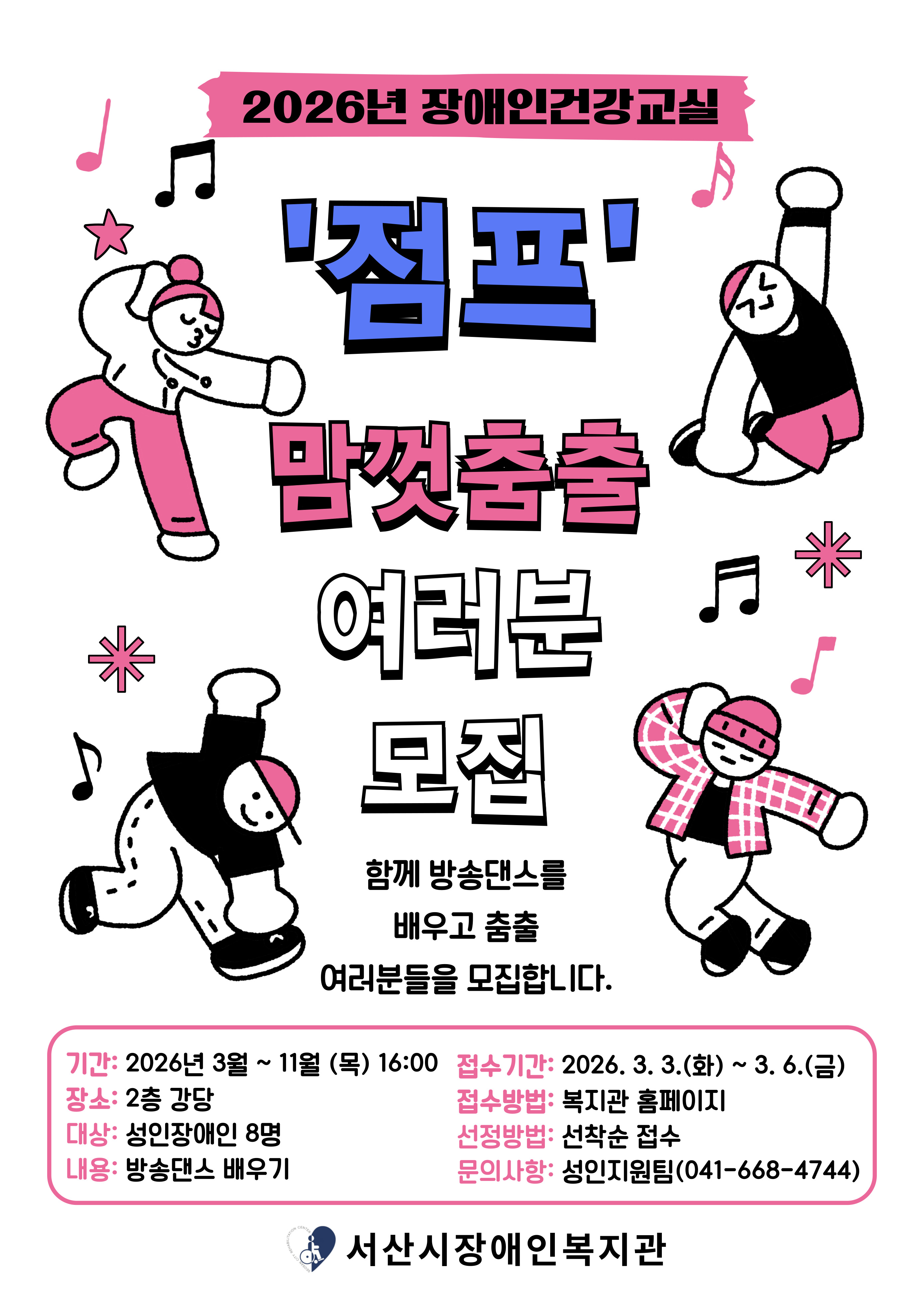 2026년 장애인건강교실 점프 참가자 모집 조혜선 이용자모집 0 78 02.26 09:16 2026년 장애인건강교실 점프 참가자 모집 1. 수업기간: 2026년 3월 ~ 11월/ 매주 목요일 16:00~17:00(수업시간은 사정에 의해 변경될 수 있습니다.)2. 수업장소: 복지관 2층 강당3. 참가대상: 성인장애인 8명4. 내 용: 방송댄스 강습5. 접수기간: 2026년 3월 3일(화) ~ 3월 6일(금)6. 접수방법: 복지관 홈페이지-참여마당-프로그램이용신청7. 선정방법: 선착순 접수8. 문의사항: 성인지원팀(041-668-4744)