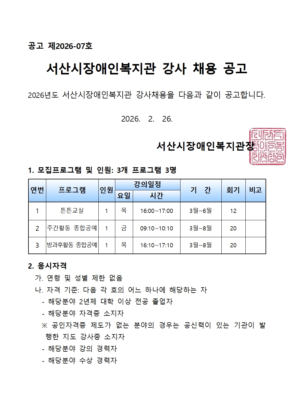 [공지] 2026년도 서산시장애인복지관 프로그램 강사 모집