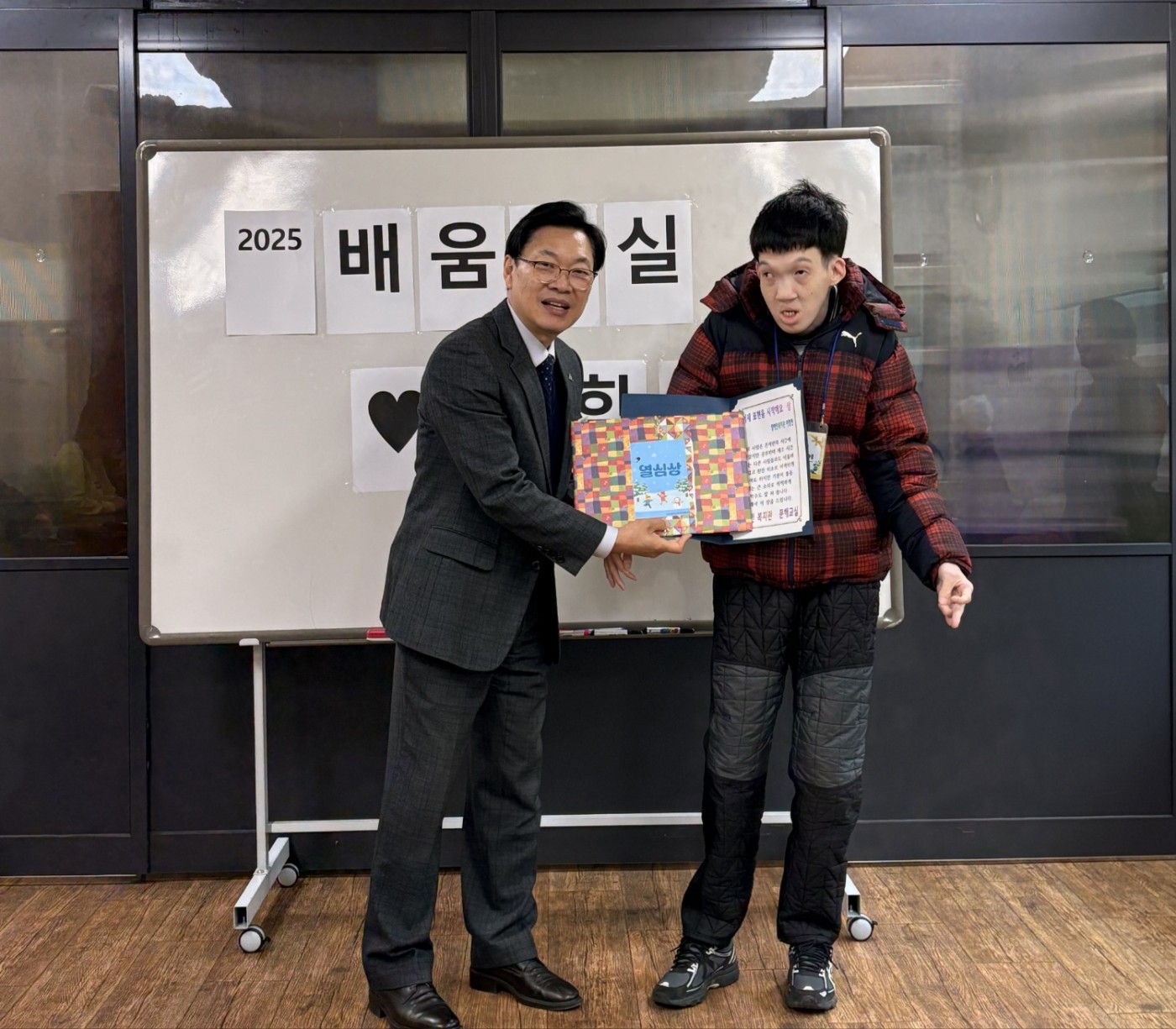 배움교실 방학식 진행 김태은 0 187 2025.12.15 11:17 2025년 한해 동안 주2회(월, 수) 진행되었던 장애인복지관 성인 문해교실 "배움교실"을 마무리 하는 방학식을 오늘 진행하였습니다. 이상복 관장님께서는 1년간 열심히 배우고 익힌 이용인들과 8명의 참여자들을 사랑과 정성으로 가르쳐 주신 조정희 강사님에 대한 수고와 감사의 인사를 전해주셨습니다.배움교실은 2주간의 방학을 가지고 다시 2026년 1월 5일에 개강합니다. (※ 배움교실 : 성인 장애인을 대상으로 한글, 수 인지학습 진행, 3년 과정)