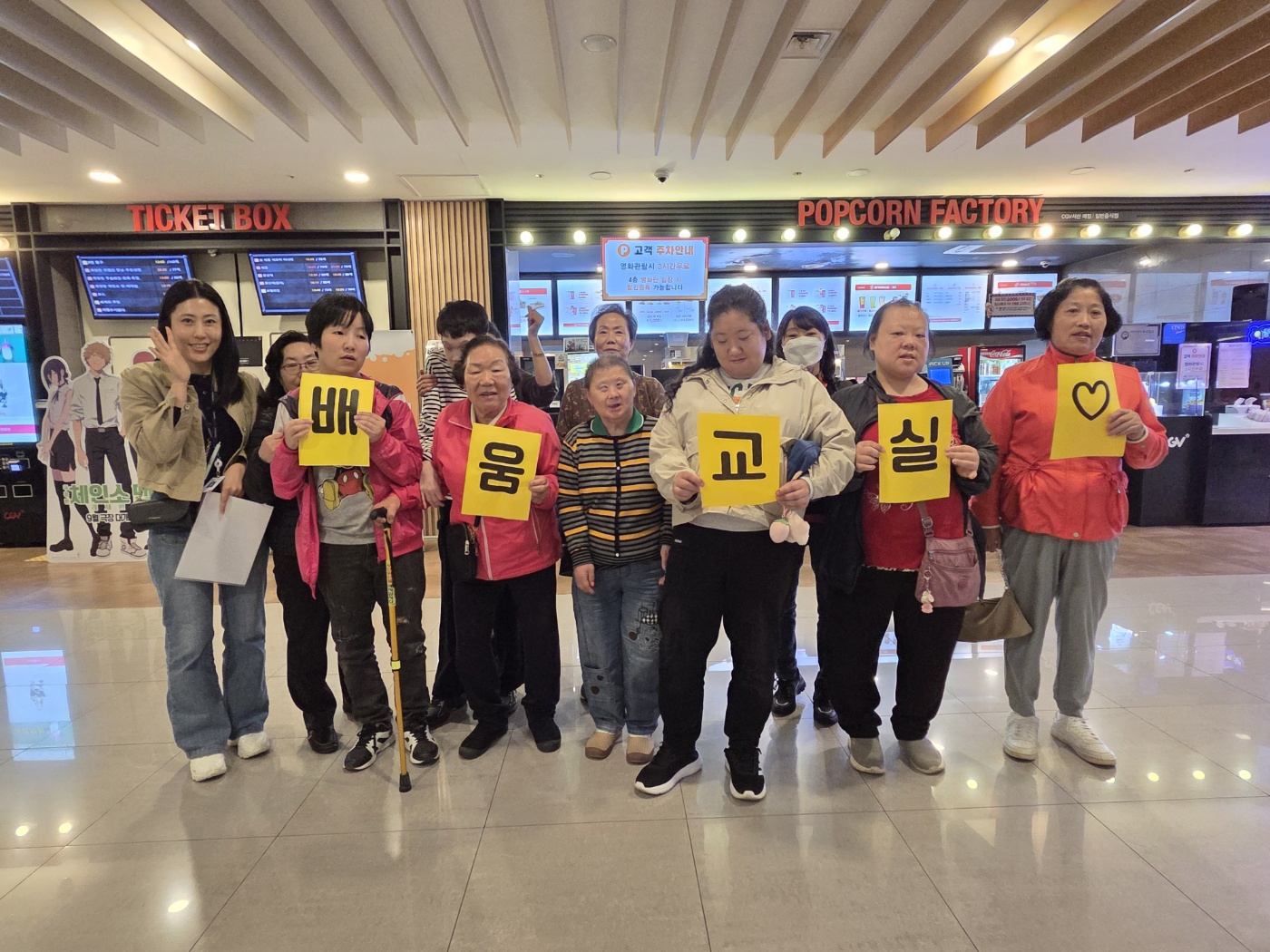 배움교실 하반기 야외활동 실시 김태은 0 65 11.11 16:38 배움교실 참여자 여덟분과 강사님과 함께 서산 CGV로 야외 활동을 다녀왔습니다. 영화관람 후 점심식사를 하고 즐거운 시간을 보내고 왔습니다.^^