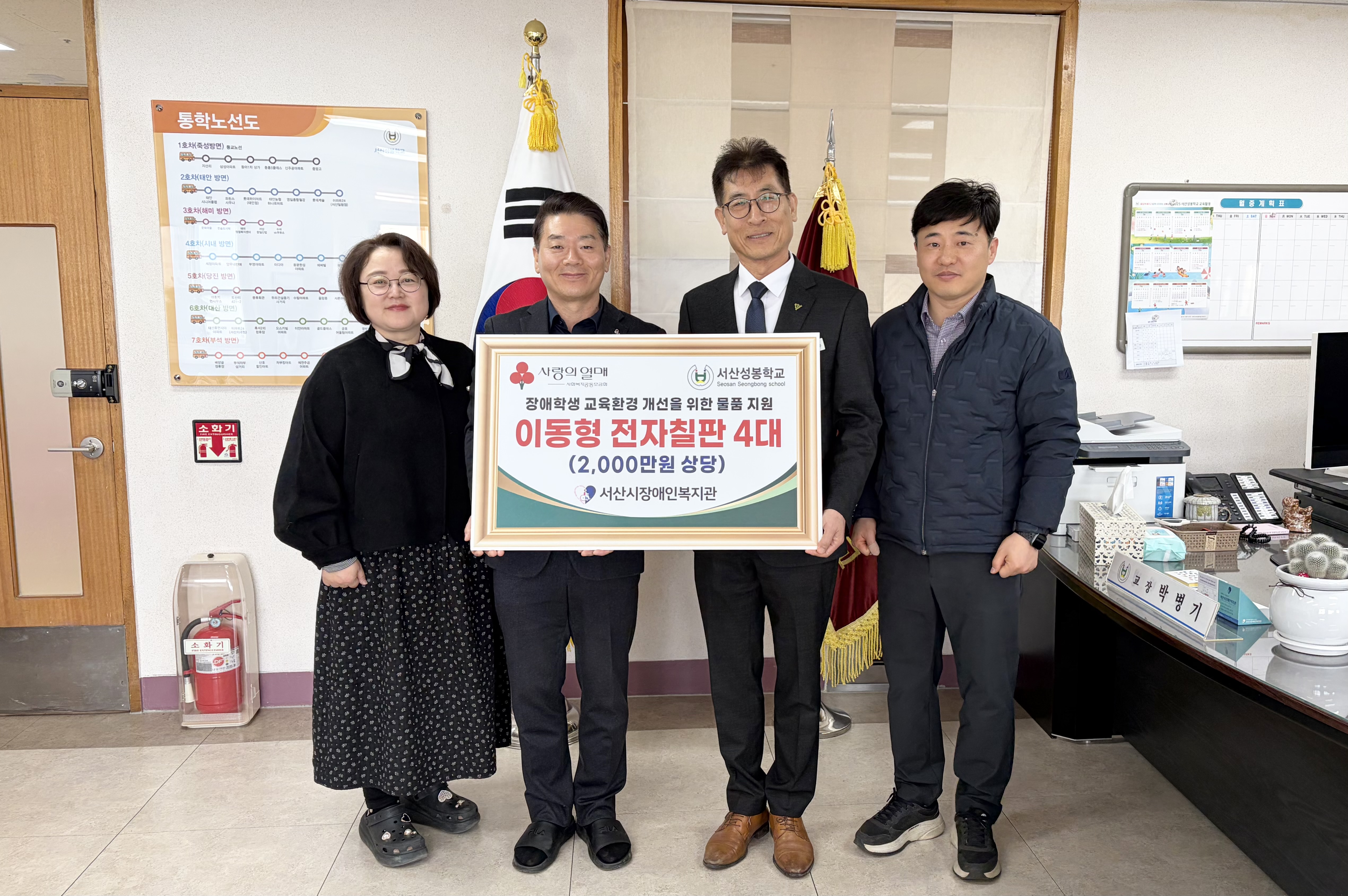 서산시장애인복지관(관장 최철우)은 3월 12일 서산성봉학교(교장 박병기)에 장애학생 교육환경 개선을 위해 이동형 전자칠판 4대를 전달했다.