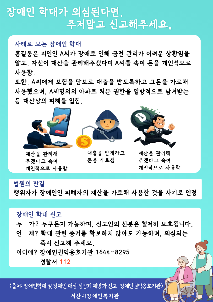 2026년 2월 인권침해 및 학대예방(정보제공) 백혜남 0 23 01.23 15:44 2월 이용자 인권침해 및 학대예방 관련 정보입니다. 지역개발팀에서는 장애 당사자의 인권침해 예방을 위한 정보를 제공하고 있습니다.문의사항은 지역개발팀(041-668-4744)으로 해 주시기 바랍니다.