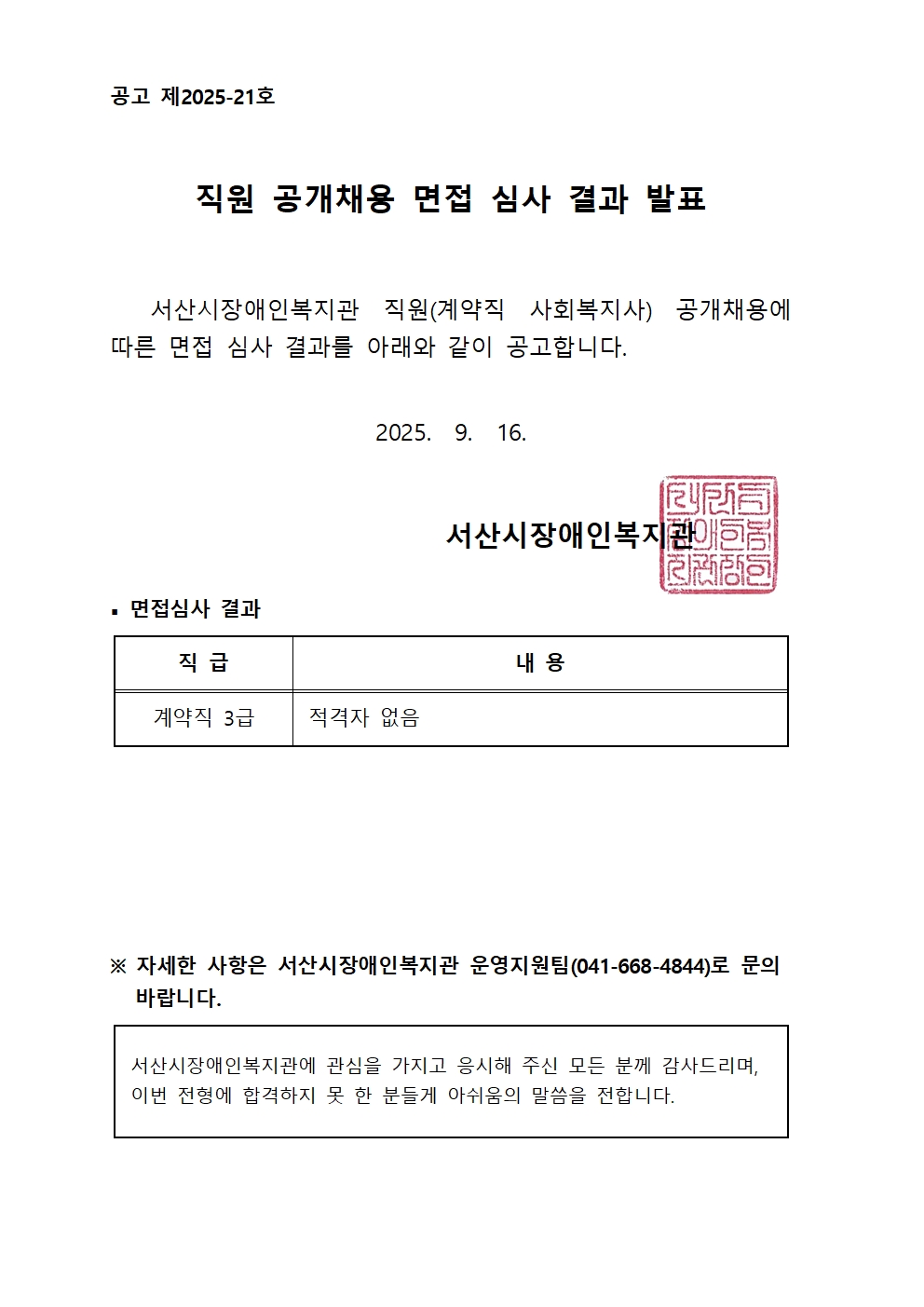 [공지] 직원 공개채용 면접 심사 결과 발표