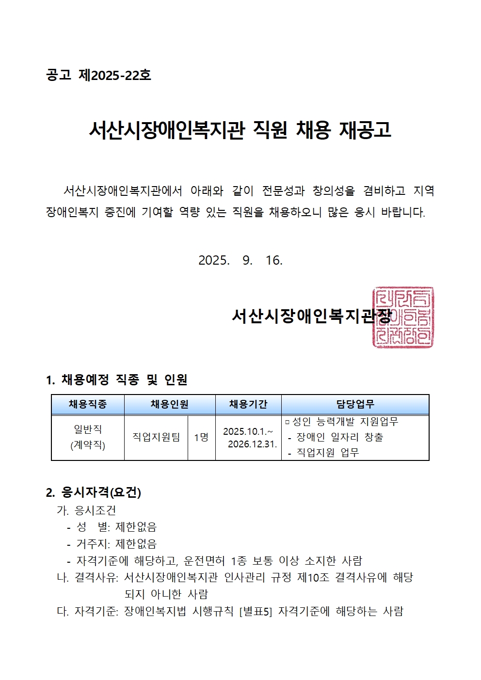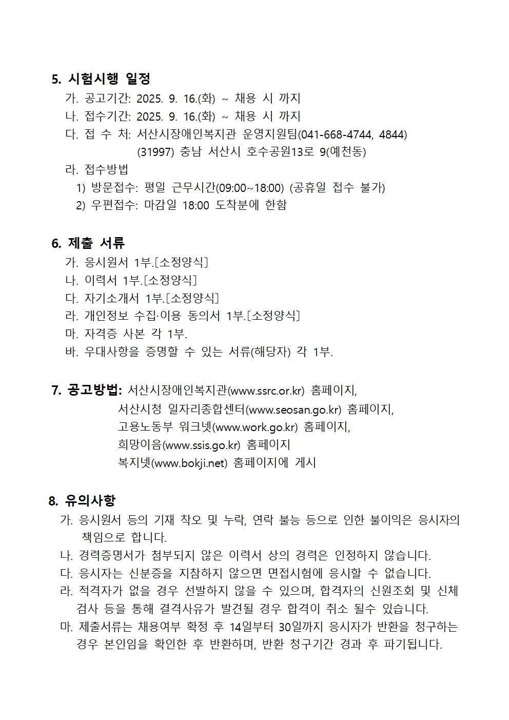[공지] 서산시장애인복지관 직원 채용 재공고