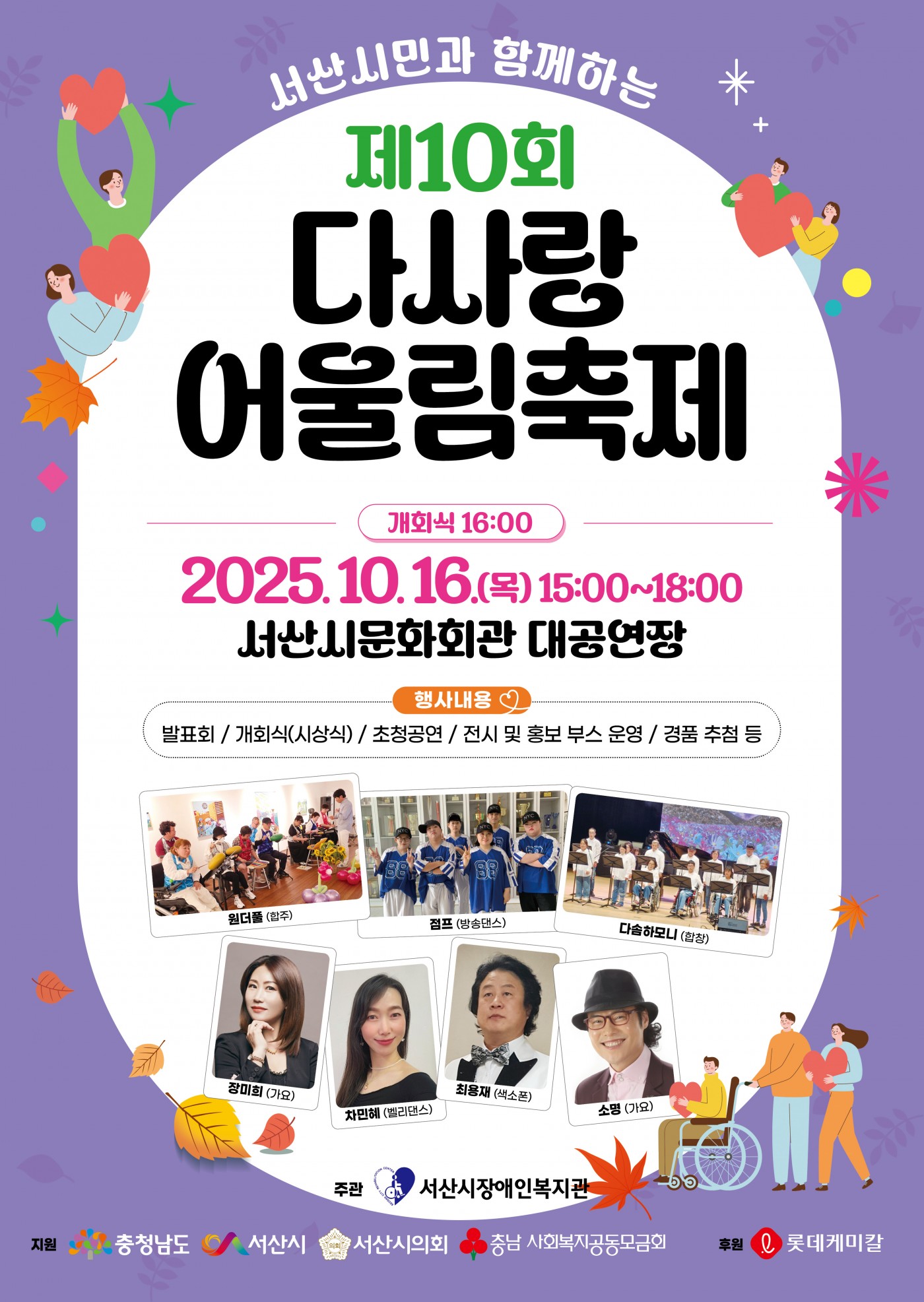 제10회 다사랑 어울림 축제 안내(10월16일) 김인수 공지 0 234 10.02 08:29 제10회 다사랑 어울림 축제 / 2025. 10. 16.(목) 15:00 / 서산시문회회관 대공연장 / 주관 : 서산시장애인복지관