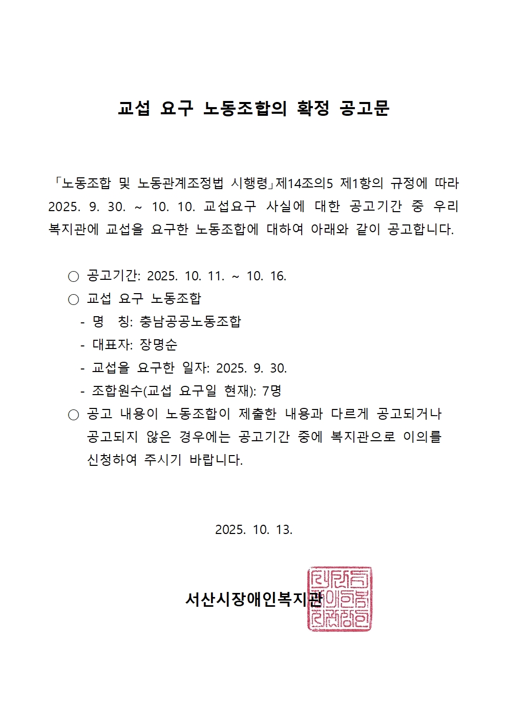 [공지] 교섭 요구 노동조합의 확정 공고문