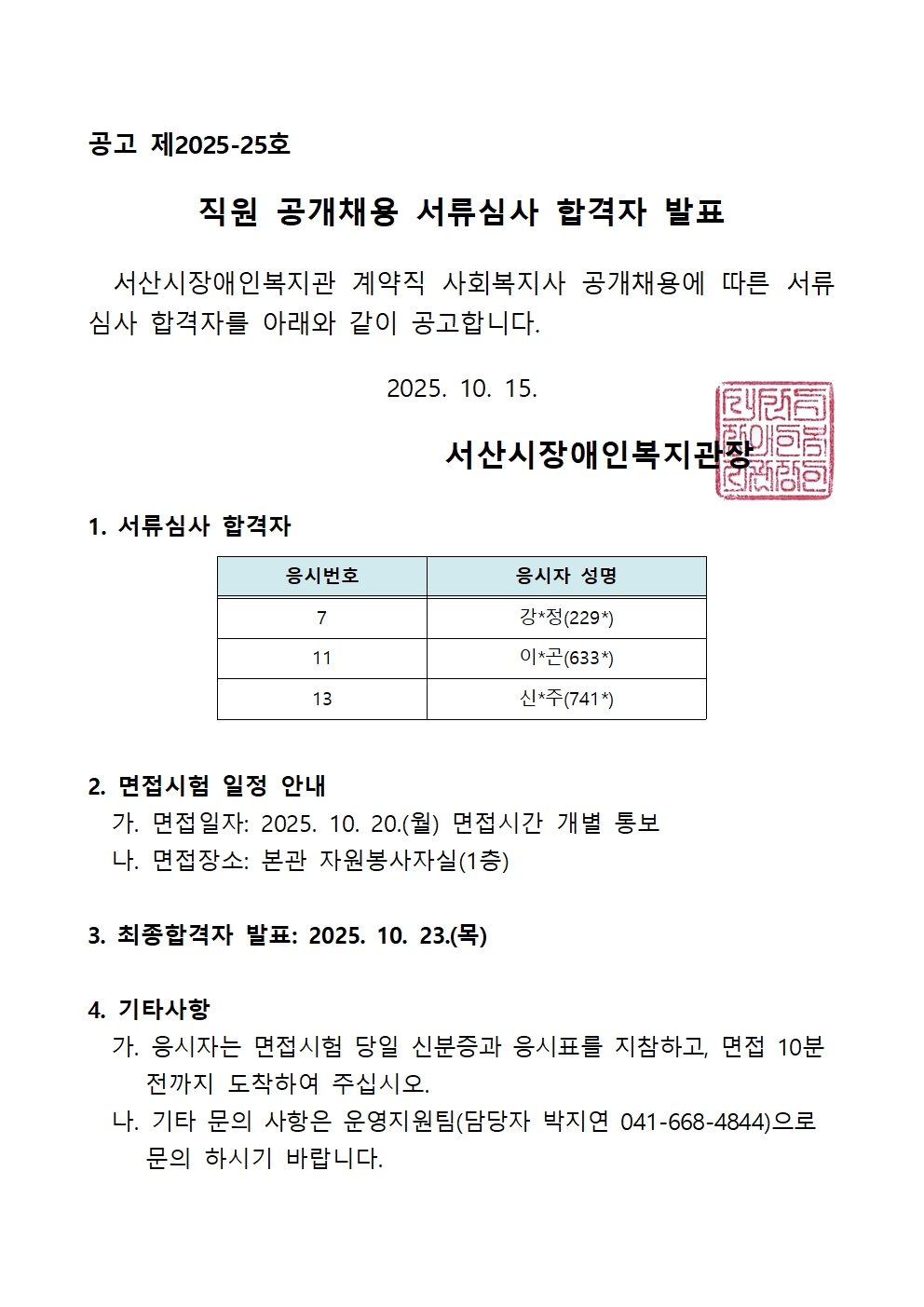 [공지] 직원 공개채용 면접 심사 결과 발표