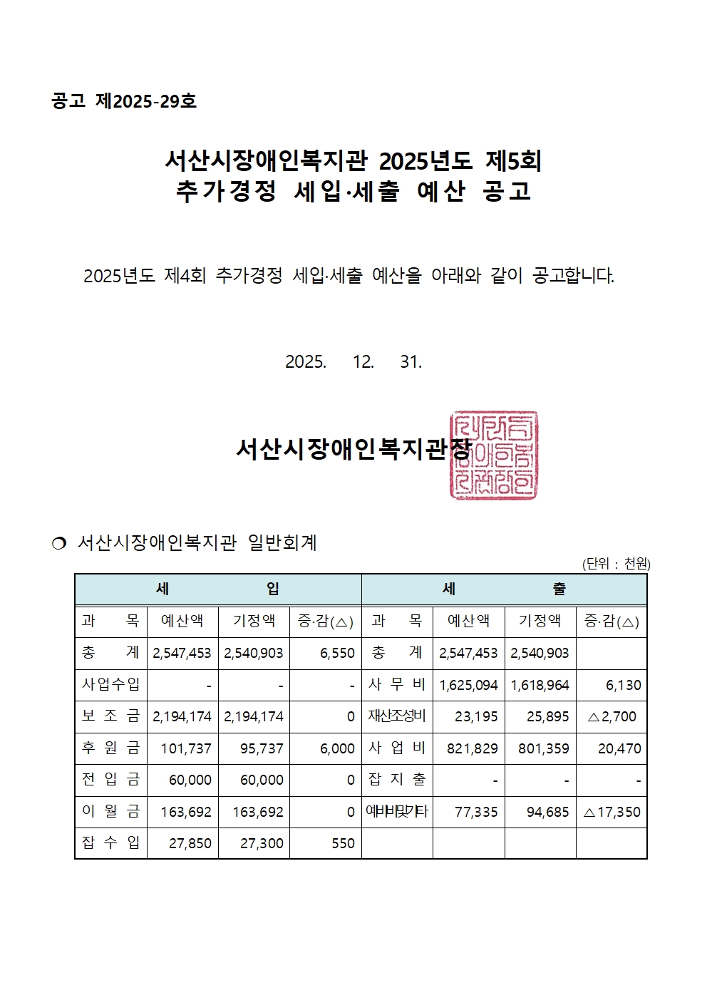 2025년도 서산시장애인복지관 제4차 추가경정예산(안) 공고