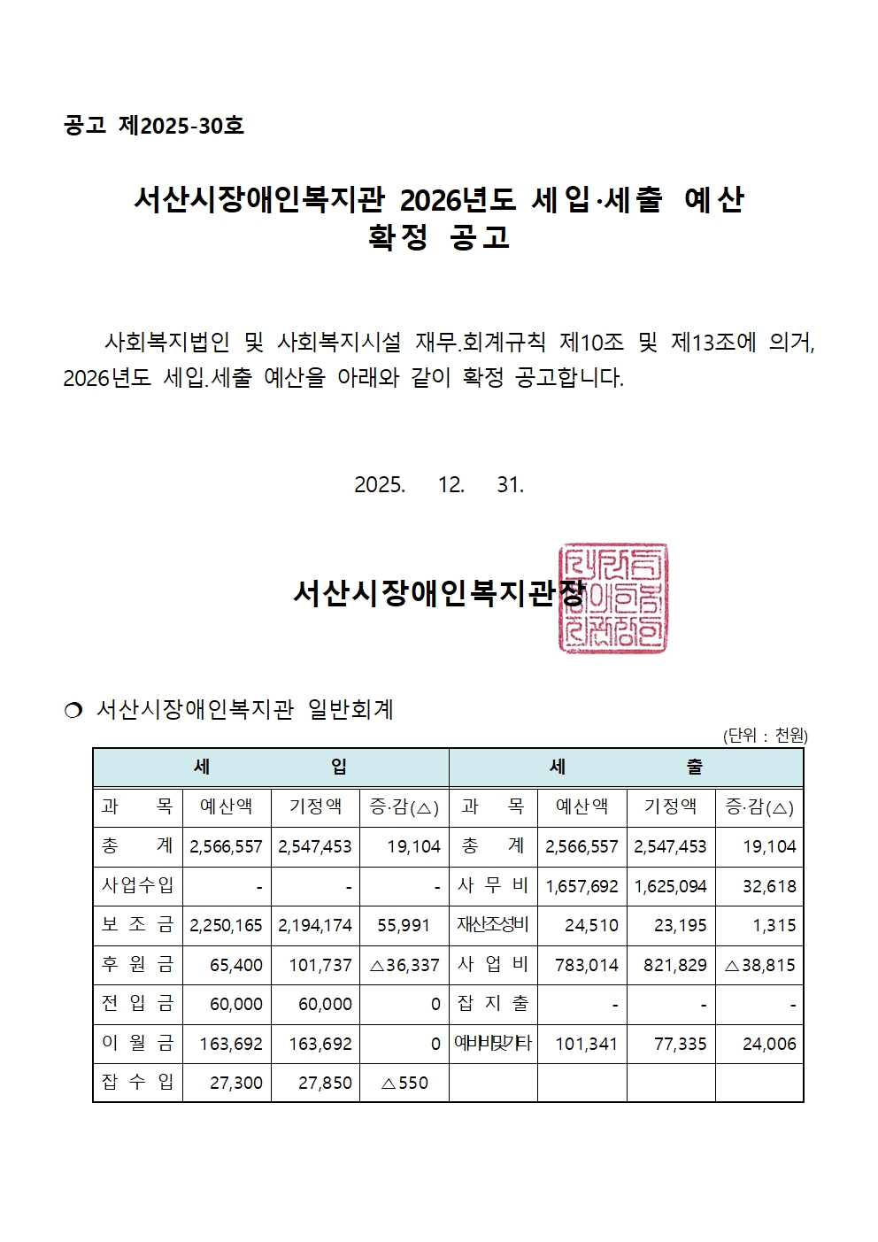 [공지] 2026년도 서산시장애인복지관 예산 공고