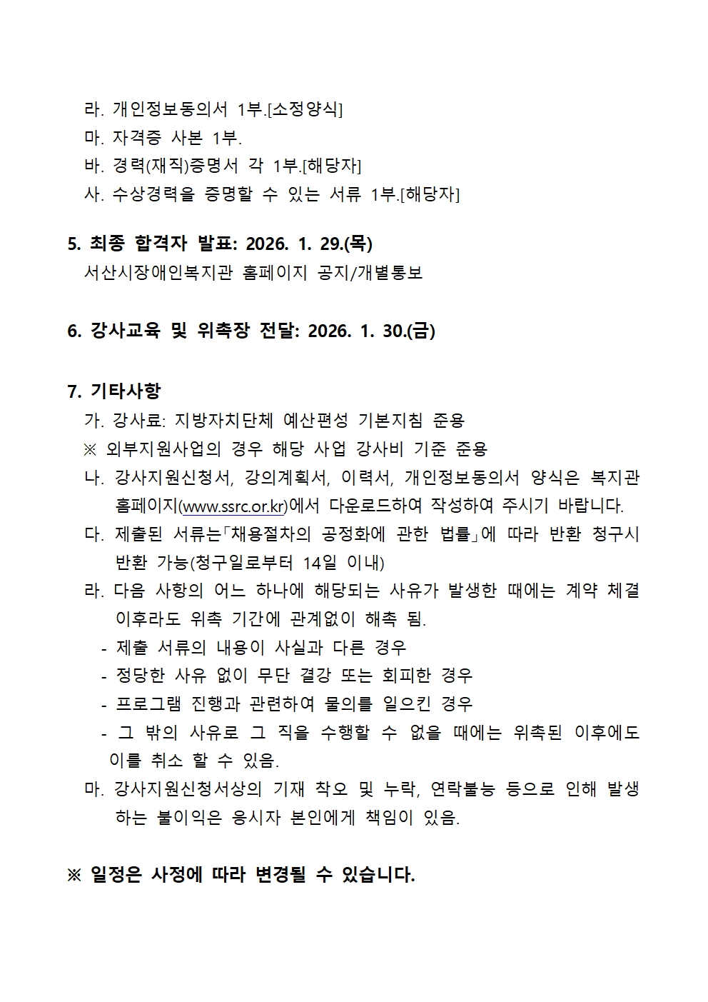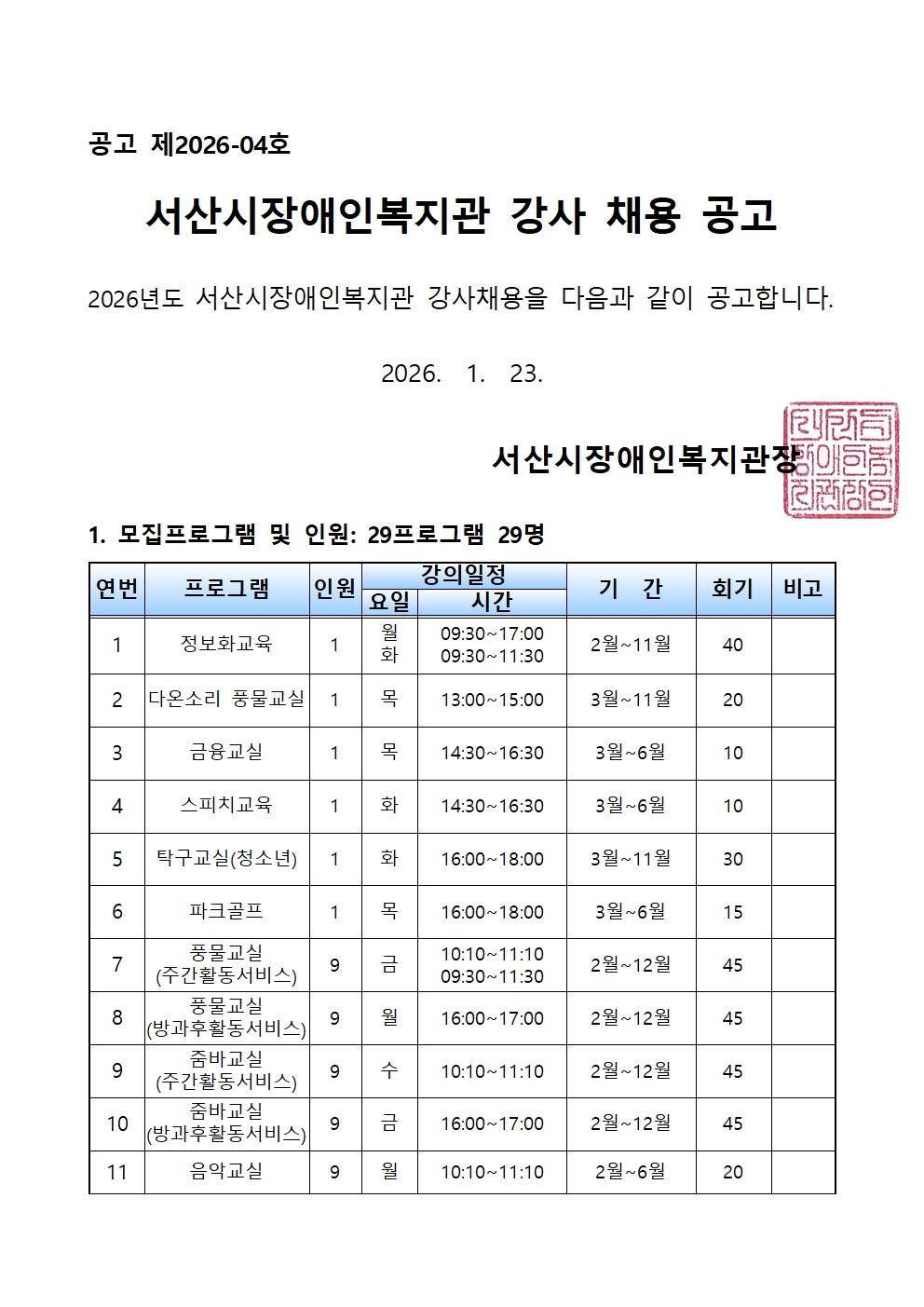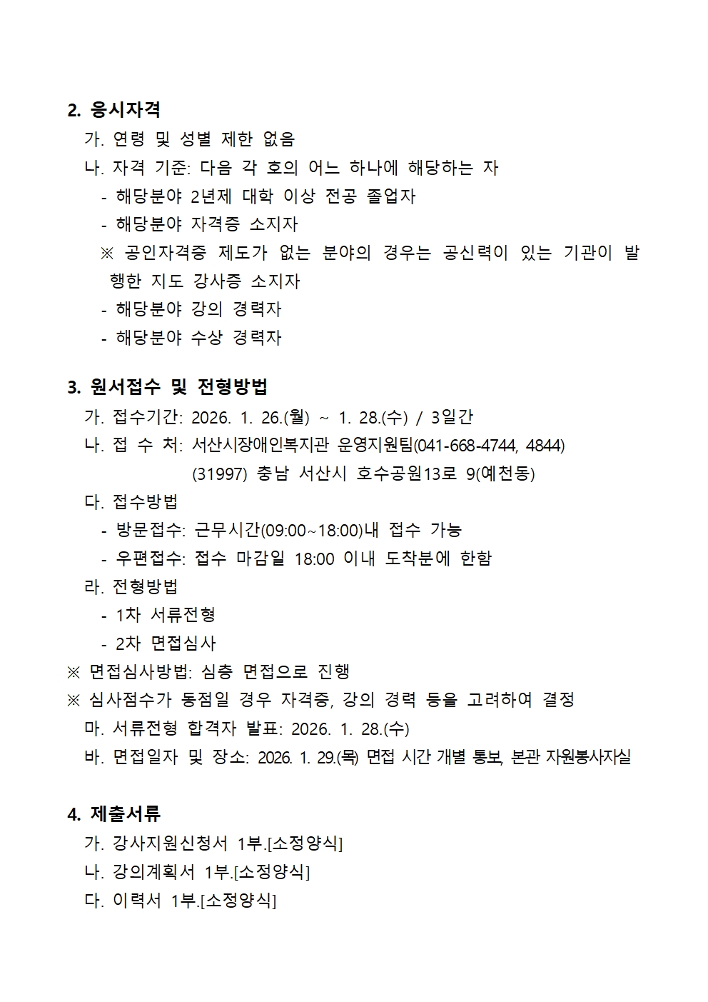 [공지] 2026년도 서산시장애인복지관 프로그램 강사 모집