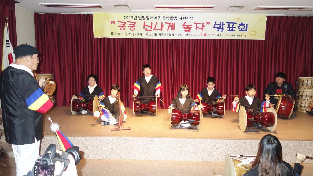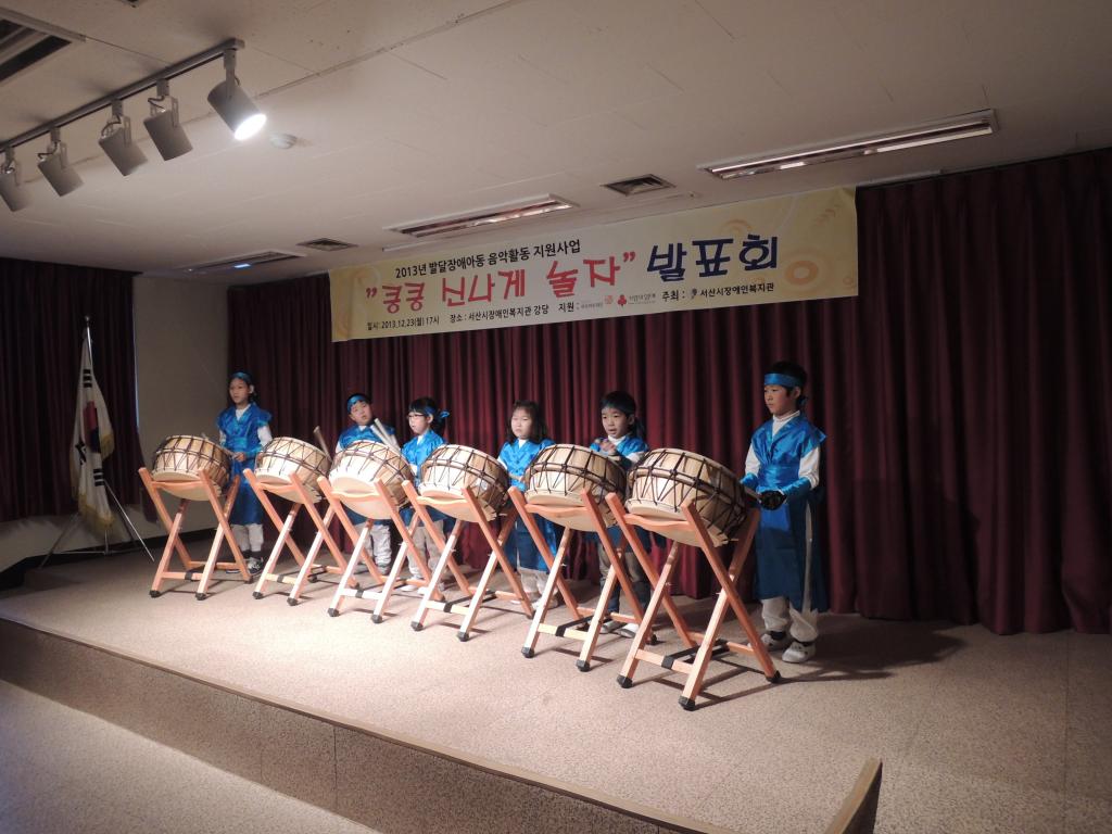 쿵쿵 신나게 놀자 발표회 조혜선 0 3587 2013.12.27 11:49 "쿵쿵 신나게 놀자" 발표회 지난 23일 늦은 5시. 장애인복지관 강당에서는 난타와 풍물 교실의 이용자들이 1년동안 갈고 닦은 실력을 발휘하는 난타와 풍물 발표회가 진행되었습니다. 난타와 풍물교실 참가자들과 부모님 등 40여명이 참석한 이번 발표회는 감동이 있는 즐거운 시간이 되었습니다. 참가자 부모 중에는 "가슴이 뭉쿨하고 눈물이 글썽일 정도로 좋은 시간이었다."는 말씀을 전해주시기도 하였다.