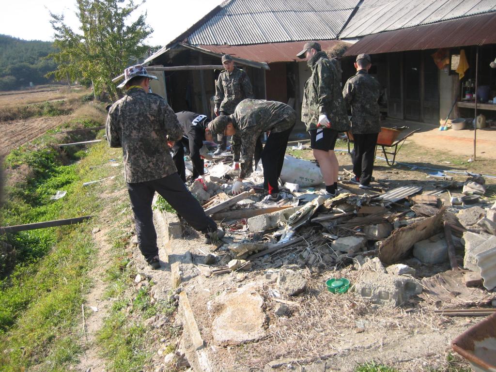 대산 공군부대 자원봉사 활동모습 박은경 0 4366 2013.10.30 09:59 2013. 10. 25.(금)에 대산 공군부대 군인 10명이 기은리 재가장애인댁을 방문하여 그동안 안전을 위협했던 무너진 담을 치워주는 자원봉사를 실시하였습니다.