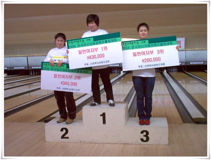 전국정신지체장애인 볼링대회 여자부 우승 서장복 0 5462 2004.11.01 13:40 지난 10월30일(토) 88올림픽체육관에서 열린 사회복지공동모금회가 후원하고 기쁜 우리복지관에서 주최한 전국정신지체장애인 볼링대회에서 박상선(정.지/2급)이 여자부에서 우승하여 상금과 상장을 받았다. 올 여름초부터 연습을(담당 이진숙 팀장)하여 5명중 2명이 (서정운, 박상선)본선에 올라 좋은 성적을 올리게 되었다.