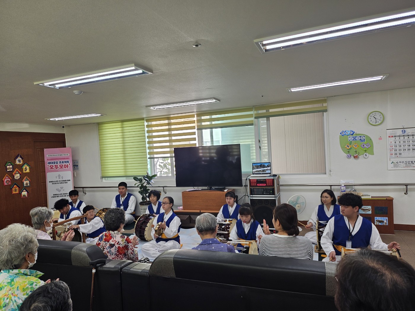 '세대공감 프로젝트 모두모아' 제2차 공익활동 박은경 0 342 2025.09.29 10:25 세대공감 프로젝트 모두모아에서는 2025. 9. 27.(토) 엘림재가노인복지센터를 방문하여 할아버지, 할머니와 즐거운 시간을 보냈습니다.그동안 갈고 닦은 사물놀이 공연과 준비한 작은 선물을 전달해 드렸습니다.