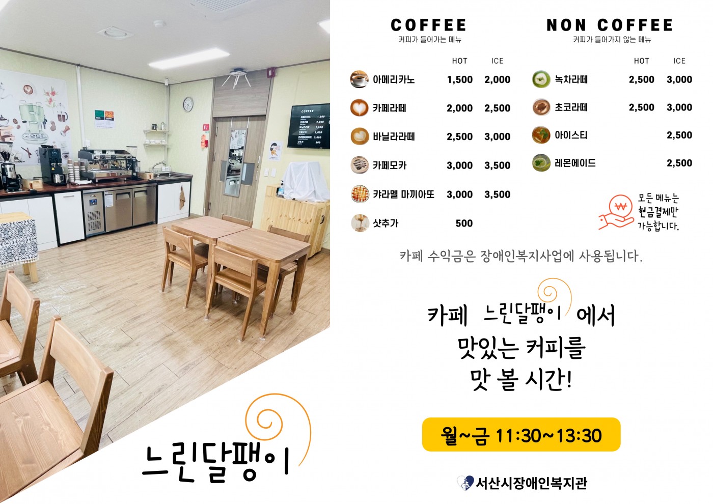카페 '느린달팽이' 운영 가윤선 0 1223 2022.04.04 17:05 4월 1일부터 복지관 카페 '느린달팽이'를 운영합니다.훈련을 통해 바리스타 자격을 취득한 장애인바리스타가 직접 커피를 만들어드리며,커피 외에도 다양한 메뉴들이 있으니 많은 관심과 이용바랍니다.*카페 운영 전/후로 소독을 실시하고 있으며, 카페 수익금은 장애인복지사업에 사용됩니다.