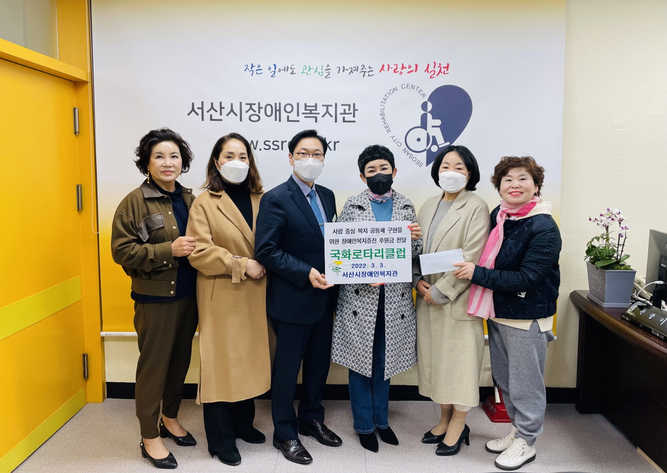 서산국화로타리클럽 후원금 전달식 김인수 0 1353 2022.03.03 17:00 금일 서산국화로타리클럽 회원분들께서 장애인복지관에 오셔서 사람중심 복지 공동체 구현을 위한 장애인복지증진 후원금을 전달해 주셨습니다.매년 복지관에 크고 작은 도움을 주고 계시는 국화로타리클럽 회원분들께 진심으로 감사드립니다.[왼쪽부터 강계실 재단위원장님, 황지영 차기 회장님, 이상복 관장님, 이순희 회장님, 한옥희 재무님, 구능현 총무님]