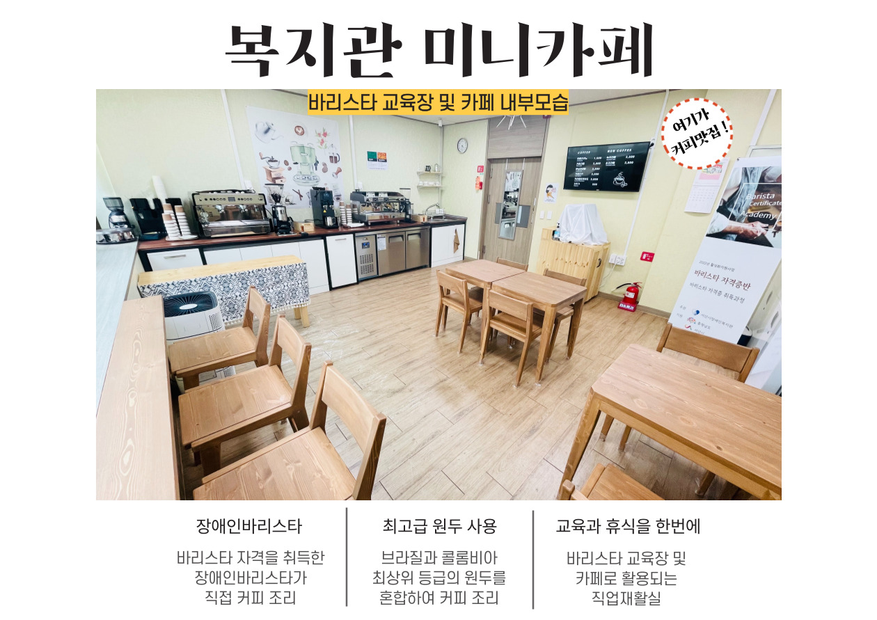 복지관 미니카페 시범운영 중! 가윤선 0 1247 2022.03.18 11:00 복지관 1층에서 미니카페를 시범운영하고 있습니다.지난 2월을 시작으로 3월에도 시범운영으로 월요일~ 금요일 11:30~13:30까지 진행되고 있으며. 바리스타교육을 수료하고 자격증을 취득한 장애인바리스타가 직접 커피를 만들어 드립니다.*카페 운영 전/후로 소독을 실시하고 있으며. 카페 수익금은 장애인복지사업비로 사용됩니다.