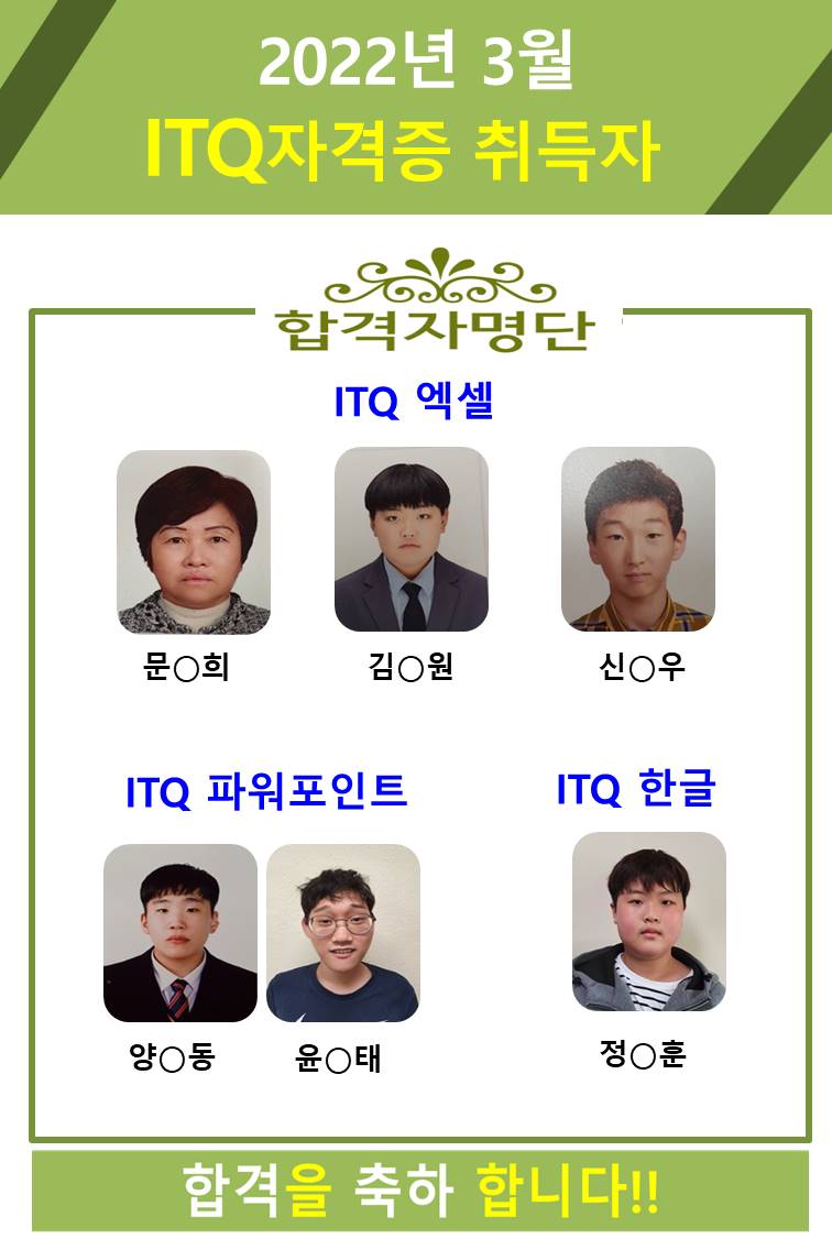 3월 ITQ 자격증 취득자!! 전현숙 0 1154 2022.03.31 17:29 3월 자격증 취득자!! 2022년 3월 12일 당진 신성대학교에서 제3회 ITQ 시험에 응시하신 분들이 합격을 하셨습니다. 진심으로 축하드립니다. 수고 많으셨습니다.!!