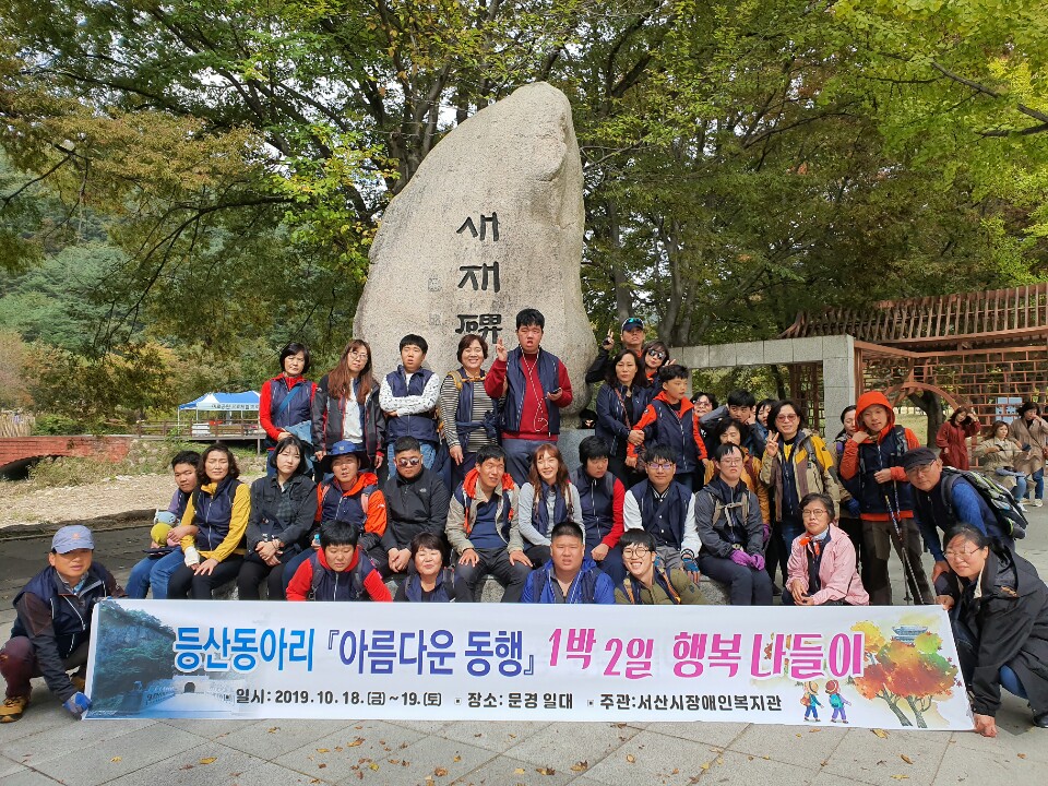 등산동아리 1박2일 행복나들이 오현주 0 2337 2019.10.21 12:51 등산동아리 1박2일 행복나들이 서산시장애인복지관에서 등산동아리 '아름다운 동행' 회원들을 모시고 10. 18.(금) ~ 19.(토) 1박2일 행복나들이를 다녀왔습니다. 장소로는 문경 일대로 주흘산을 산행하였고 문경 레일바이크, 문경사과따기, 비봉산레일바이크, 만천하스카이워크 등 다양한 체험을하여 즐거운 시간들을 보냈습니다.