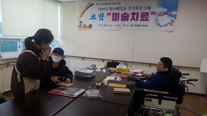 2019년도 도활성화지원사업 '미술치료' 백정미 0 2166 2019.03.08 14:41 성인 장애인의 자아 존중감 향상과 긍정적인 자기표현을 위한 집단미술치료를 3월 8일(금) 시작하였습니다. 2019년도 미술치료는 매주 금요일 성인 장애인 8명을 대상으로 16회기 동안 진행합니다. 오늘은 첫 시간으로 그림검사, 자아 존중감 검사 등 사전검사와 자기소개를 통해 서로 알아가는 시간을 가졌습니다. 집단미술치료를 통하여 표현력과 자신감을 향상시키고 서로 공감하며 서로에게 따뜻함을 전하는 시간이 되길 바랍니다.