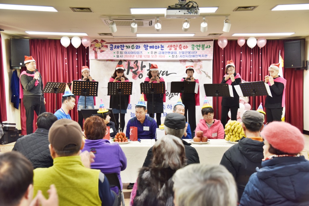 함께하는 생일잔치 박인경 0 2650 2018.12.12 15:49 함께하는 생일잔치 생일을 맞으신 복지관 이용자분들을 모시고 12월 12일(수) 2층 강당에서 함께하는 생일잔치를 진행하였습니다. 체력단련실 이용자들을 대상으로 진행 되는 생일잔치를 통해 화합의 장을 마련하고 이웃 사랑을 다시 한 번 느낄 수 있는 계기가 되고 있다. 이날 생일을 맞으신 분들에게 금채안 가수의 공연고 더불어 신발끈봉사단에서도 함께 오셔서 축하공연을 해 주셨다. 신나는 공연을 통해서 신명나는 생일잔치가 될 수 있었다.