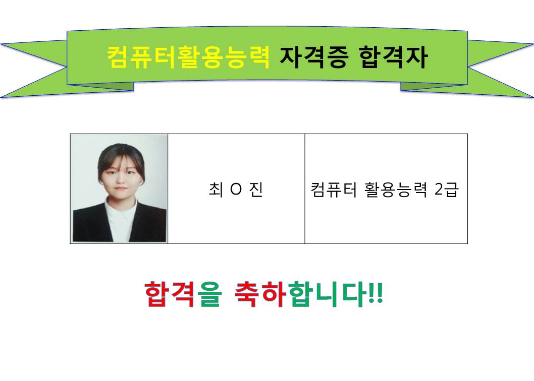 최O진님은 정보화교육 자격증반에서 열심히 노력하셔서 실기시험을 한번에 합격하셨습니다.