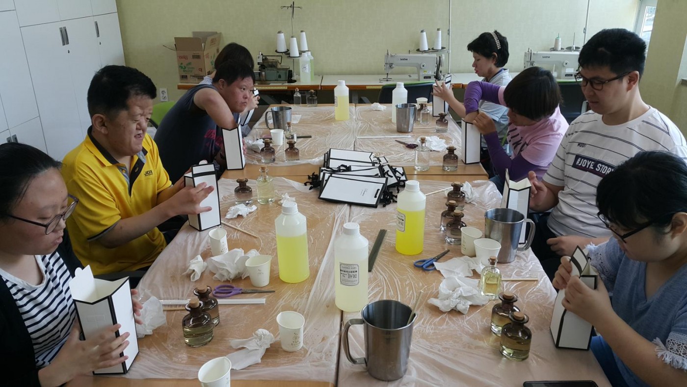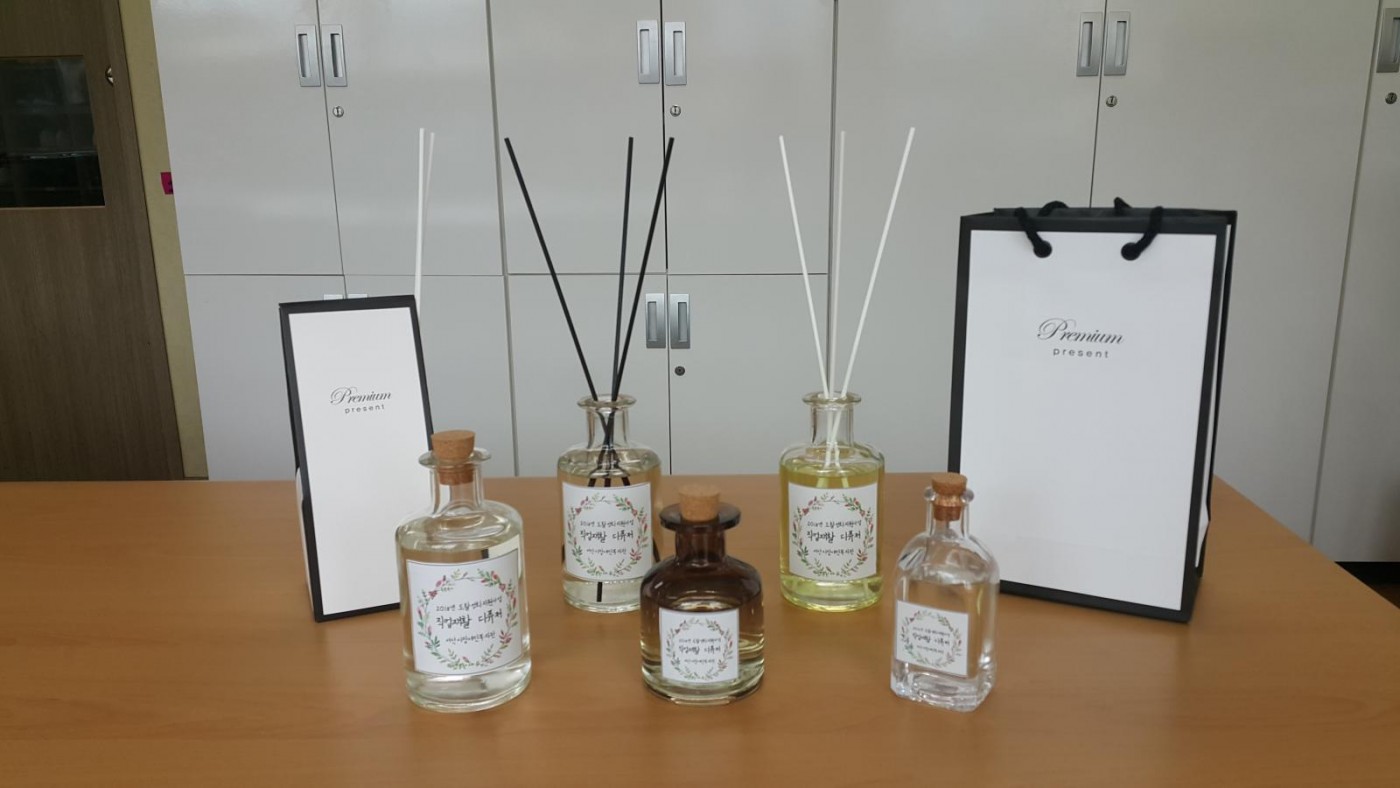 디퓨저 제작은 직업적응훈련생들이 직접 디퓨저 제작 및 포장 과정에 참여하여 작업수행에 필요한 기초기술을 습득하고 결과물은 내방객, 이용자 생신잔치, 기관행사 시 홍보물품으로 활용할 예정입니다.