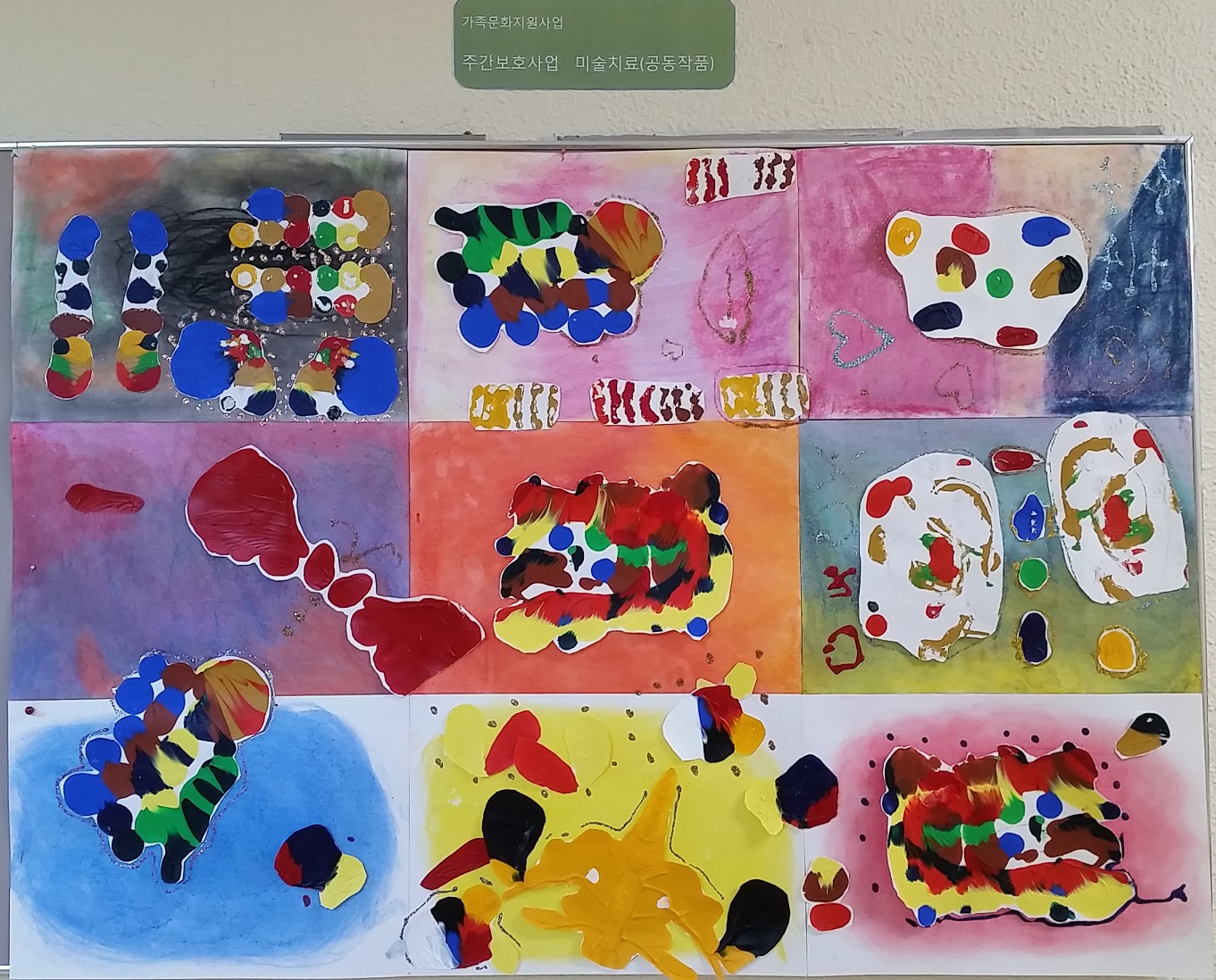 가족문화지원사업 주간보호실 미술치료 최지영 0 3565 2017.03.15 14:01 미술치료 공동작품을 자랑합니다. 우리 주간 보호실에서 2주에 걸쳐 만든 공동 작품을 자랑합니다.미술치료 선생님과 함께하는 즐거운 활동 시간!미숙하지만 이용자들이 물감을 묻혀 찍어내는 활동을 하면서 " 와와~~~" 감탄사를 연발하는 시간이었습니다. 작품을 2층 게시판에 전시하였는데 이용자들이 뿌듯해하며 다른 사람들에게 자신의 작품을 자랑하는 모습이 너무나 귀엽게 느껴집니다.