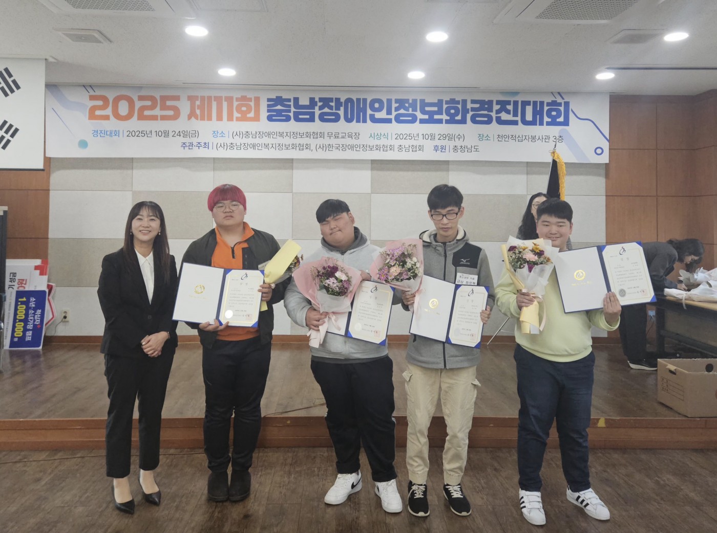 충남장애인정보화경진대회 청소년부 파워포인트 금상 수상 박지애 0 85 10.30 17:16 2025년 10월 24일 금요일 충남장애인복지정보화협회에서 열린 제11회 충남장애인정보화경진대회에서 우리 복지관 소속 조재호(14세, 자폐, 맨오른쪽) 학생이 청소년부 파워포인트 금상을 수상하는 성과를 거두었습니다. 조재호 학생은 이번 대회가 첫 출전이며, 매주 정보화수업을 듣고 매일 집에서 복습하며 성실히 대회를 준비해 왔습니다. 많은 축하 부탁드립니다^^